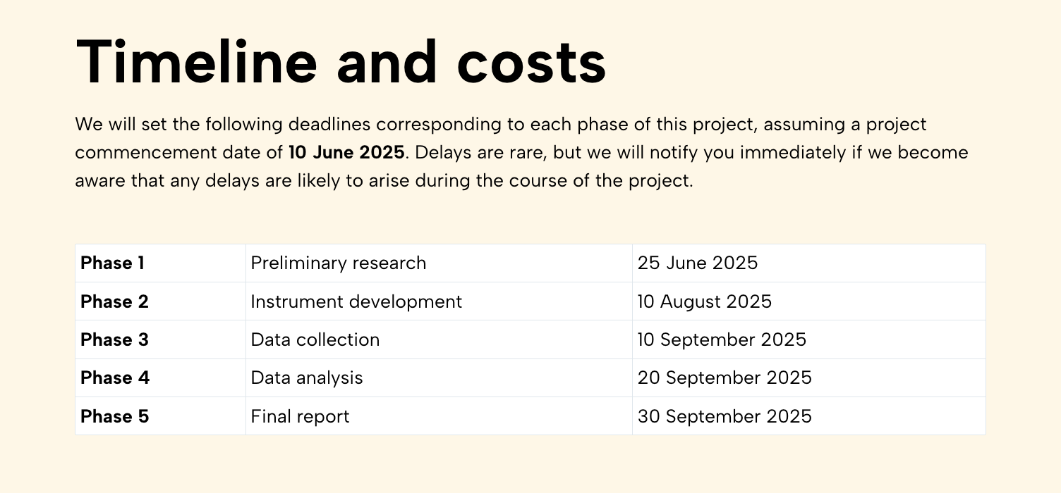 We’ve had a look at how to categorize essential information so that it reads as a practical yet engaging market research proposal. Key takeaways: Be thorough (leave no stone unturned!), be clear in your structure, and include some data-backed confidence.