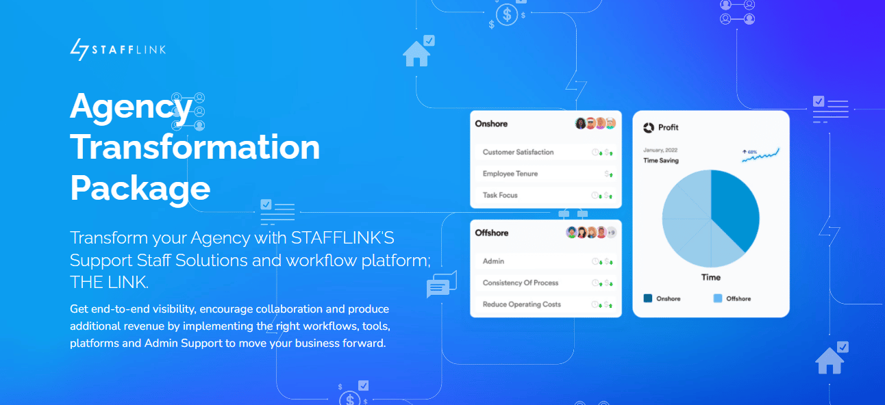 STAFFLINK is one of the fastest-growing companies in Australia’s real estate industry. Founded by real estate agents wanting more innovative solutions, they help real estate agencies increase productivity, cut costs, and increase sales revenue by streamlining processes and onshore and offshore team expansion.
