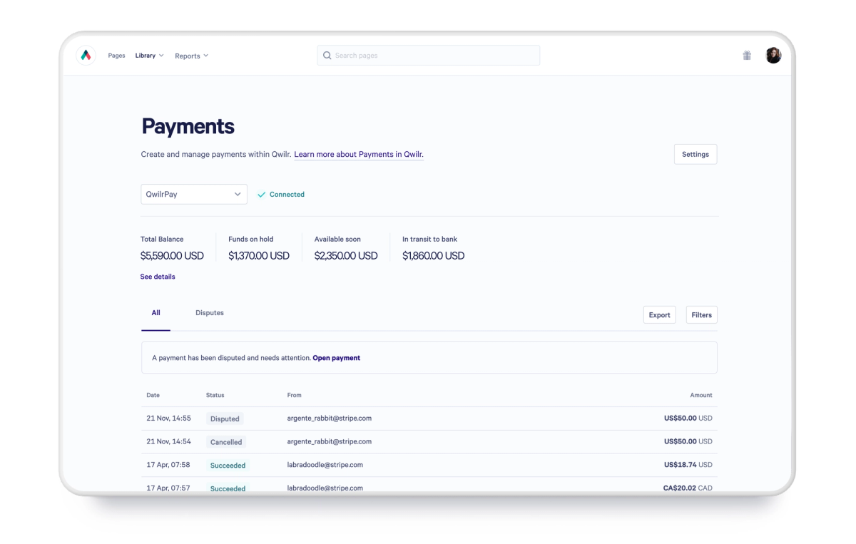 Let buyers pay how they want. QwilrPay lets you collect payments via credit card, direct debit, bank transfer/ACH.
