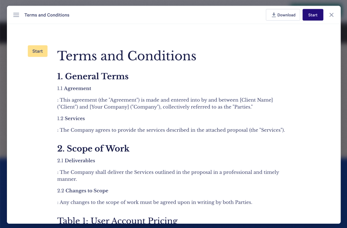 Combine stunning proposals, plain-text agreements, and secure e-signatures in one tool. Add print-friendly agreements alongside dynamic content and collect legally compliant e-signatures with ease. Track progress, capture multiple signatures, and close deals faster with Qwilr’s integrated e-sign functionality.