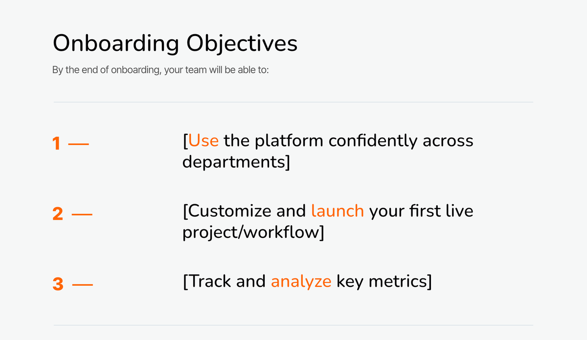 Strong onboarding objectives help define what a successful customer onboarding plan looks like before implementation begins. The template includes pre-written prompts that guide teams to outline goals, responsibilities, and success criteria in a format that’s easy to customize for each client. By clearly documenting outcomes upfront, this section creates alignment, reduces uncertainty, and sets the foundation for a structured onboarding experience.