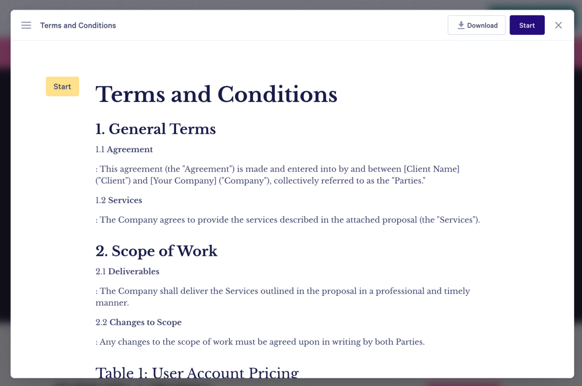 Combine stunning proposals, plain-text agreements, and secure e-signatures in one tool. Add print-friendly agreements alongside dynamic content and collect legally compliant e-signatures with ease. Track progress, capture multiple signatures, and close deals faster with Qwilr’s integrated e-sign functionality.