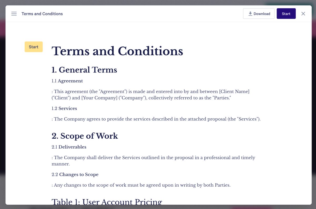 Combine stunning proposals, plain-text agreements, and secure e-signatures in one tool. Add print-friendly agreements alongside dynamic content and collect legally compliant e-signatures with ease. Track progress, capture multiple signatures, and close deals faster with Qwilr’s integrated e-sign functionality.