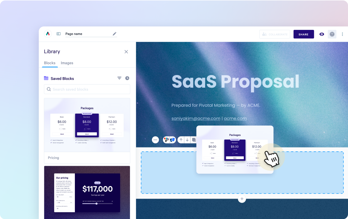 Impress buyers with interactive proposals that stand out. Qwilr’s drag-and-drop editor makes it easy to create on-brand, stunning collateral — no design skills needed. Add videos, dynamic pricing, and ROI calculators to deliver a unique experience, while automated brand customizations ensure every proposal looks professional.