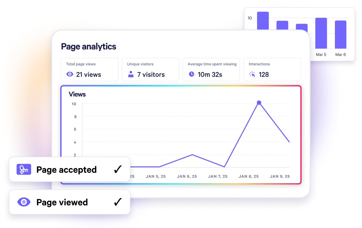 Combine stunning proposals, plain-text agreements, and secure e-signatures in one tool. Add print-friendly agreements alongside dynamic content and collect legally compliant e-signatures with ease. Track progress, capture multiple signatures, and close deals faster with Qwilr’s integrated e-sign functionality.