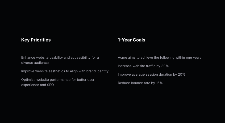The strongest website design proposals start with alignment. This section comes pre-filled with structured content to help you capture your client’s website priorities—whether that’s increasing traffic, improving UX, launching faster, or integrating with a specific tech stack. It’s easy to personalize the template to reflect the specific goals of any project while keeping the messaging strategic and focused.